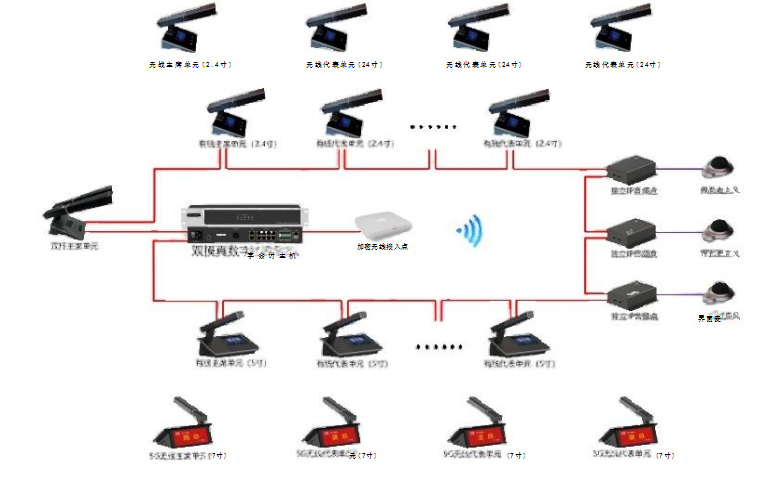 產(chǎn)品概述))進道(HJD)系列-雙模混搭真數(shù)字會議討論系統(tǒng)是由華聲視訊創(chuàng)新推出的一種先進的會議討論系統(tǒng)解決 方案,引領(lǐng)行業(yè)進入智能會議新時代,高端智能會議系統(tǒng)將為您帶來前所未有的會議體驗?;贗P技術(shù)的真數(shù) 字處理,結(jié)合5G 音頻傳輸技術(shù),系統(tǒng)不僅實現(xiàn)了數(shù)字音頻的高清轉(zhuǎn)換和穩(wěn)定傳輸,還通過每個單元的獨立 IP 地址支持無線擴展;系統(tǒng)同時兼容有線單元和無線單元混搭使用,滿足不同規(guī)模會議的需求。